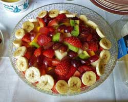 Fruit salad is a dish consisting of various kinds of fruit, sometimes served in a liquid, either in their own juices or a syrup. When served as an appetizer or as a dessert, a fruit salad is sometimes known as a fruit cocktail or fruit cup. In different forms fruit salad can be served as an appetizer, a side-salad, or a dessert.